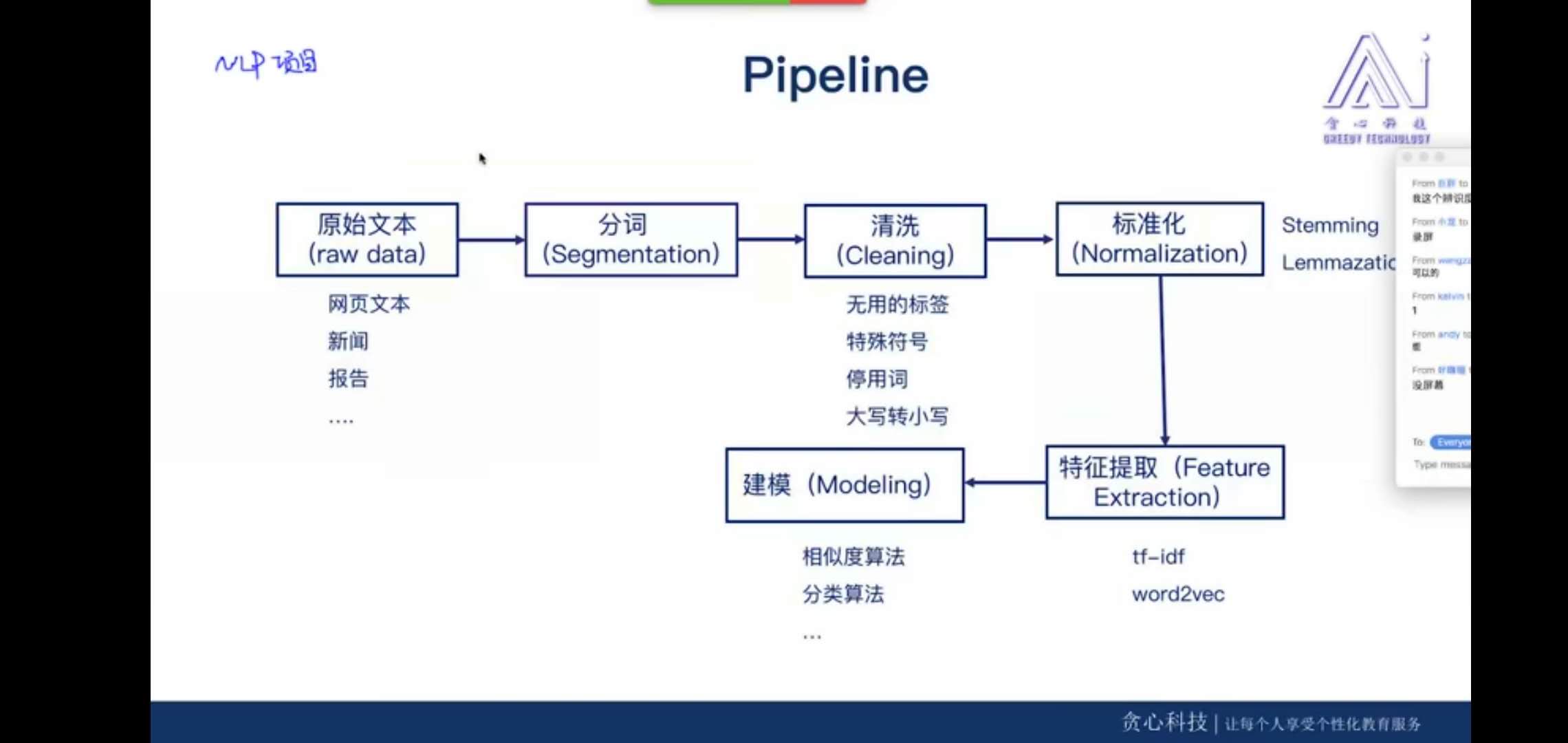 贪心学院nlp 发表于 2020-07-07 | 更新于 2021-01-06 | 分类于 NLP | 阅读次数: NLP项目流程原始文本—->分词—–>清洗—–>标准化—–>特征提取——>建模 分词方法1.$\textcolor{red}{分词工具}$ 1.jieba分词 2.SnowNLP 3.LTP 4.HanNLP 2.$\textcolor{red}{分词方法}$ 1.最大匹配算法 ①前向最大匹配算法